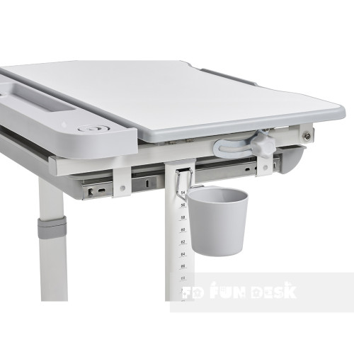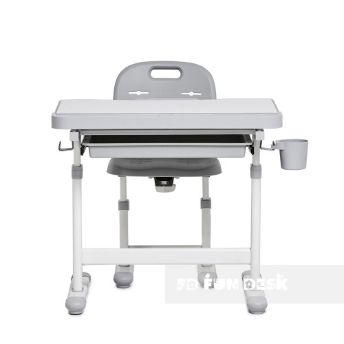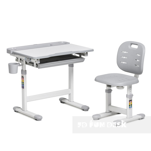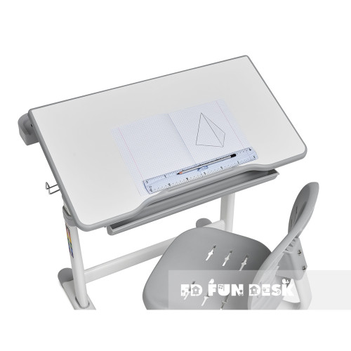 FunDesk Cura Grey - универсальный цвет парты подойдет к любому интерьеру. Столешница легко может настраивается в режим мольберта, рабочую поверхность парты наклоняется до 40° для удобного письма, чтения, рисования. Регулируемая высота парты и стула, удобный выдвижной ящик для хранения ручек и карандашей.