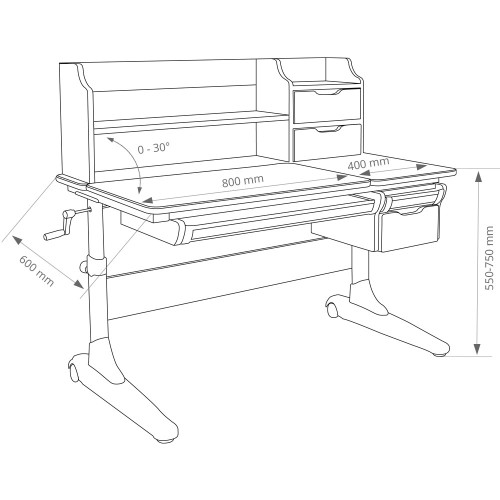 Особенностью данной модели является надстройка со встроенной, выдвижной подставкой для книги, двумя дополнительным ящиками и широкой полкой, что идеально подходят для хранения всех необходимых книг и тетрадей.