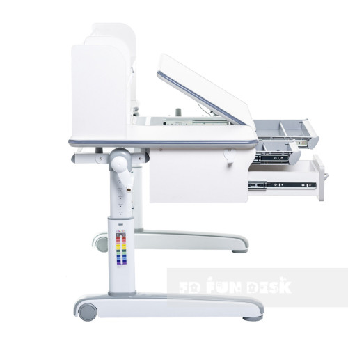 Стол-трансформер Libro ― эргономичный, с увеличенной рабочей поверхностью и дополнительными полками, регулируемый по высоте с современным дизайном. Специальный дизайн без острых углов защищает от повреждений. Расположены два выдвижных ящика для хранения канцелярских принадлежностей. Многоступенчатая регулировка высоты позволяет расти парте вместе с Вашим ребенком.