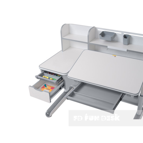 Стол-трансформер Libro ― эргономичный, с увеличенной рабочей поверхностью и дополнительными полками, регулируемый по высоте с современным дизайном. Специальный дизайн без острых углов защищает от повреждений. Расположены два выдвижных ящика для хранения канцелярских принадлежностей. Многоступенчатая регулировка высоты позволяет расти парте вместе с Вашим ребенком.