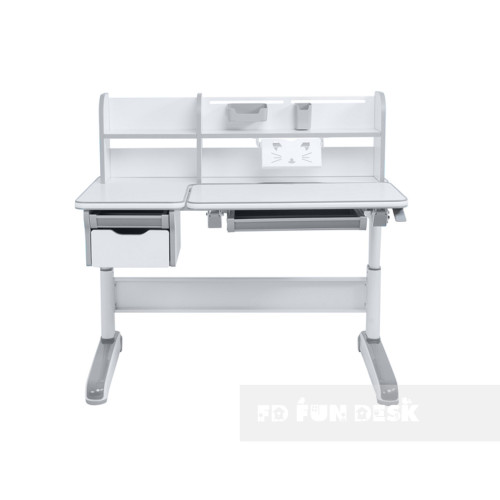 Стол-трансформер Libro ― эргономичный, с увеличенной рабочей поверхностью и дополнительными полками, регулируемый по высоте с современным дизайном. Специальный дизайн без острых углов защищает от повреждений. Расположены два выдвижных ящика для хранения канцелярских принадлежностей. Многоступенчатая регулировка высоты позволяет расти парте вместе с Вашим ребенком.