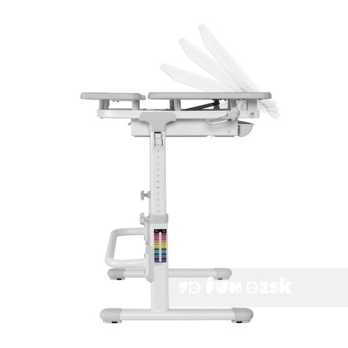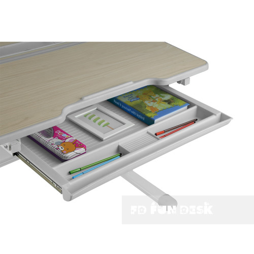 Парта Lavoro L – эргономичная, компактная, регулируемая по высоте. Поверхность учебного стола можно наклонять до 50 ° для удобного письма, чтения и рисования. Наличие специальной защиты от защемления пальцев позволяет уберечь руки вашего ребенка от повреждений. Под столешницей расположена выдвижная полка с несколькими отделениями, что обеспечивает достаточно места для хранения книг и канцелярских принадлежностей. Наличие многоступенчатого механизма регулировки высоты позволяет парте «расти» вместе с вашим ребенком.