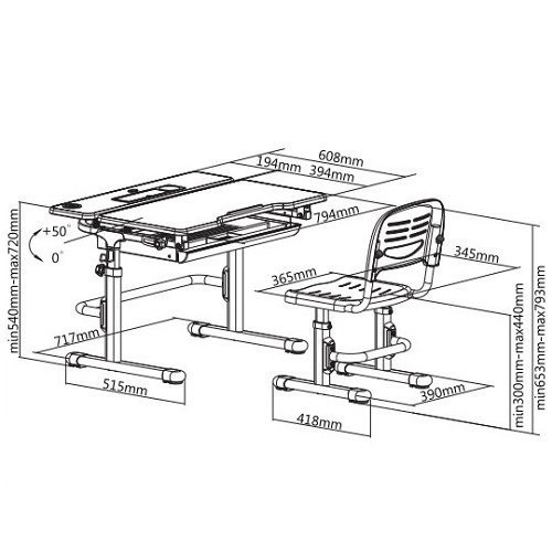 Размер стола (ШхГхВ): 794 x 608 x 540 - 720 мм