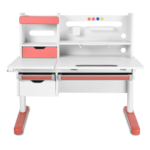 Эргономичная, растущая парта с вместительной надстройкой. Надстройка включает в себя один выдвижной ящик, три полки, выдвижную подставку для книг, и специальные отверстия для крепления аксессуаров.