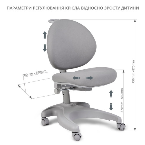 Кресло регулируется под рост ребенка от 750 до 870 mm.