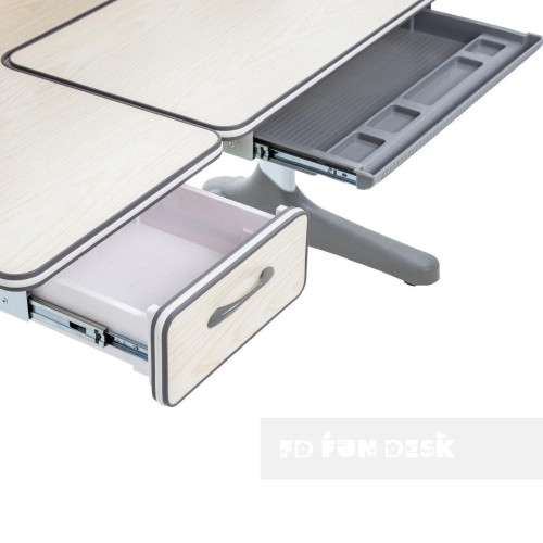 Парта Ammi – эргономичный, регулируемый по высоте стол. Удобная рабочая поверхность парты с множеством секций для размещения книжек, тетрадей и других канцелярских принадлежностей, под столешницей расположена выдвижная полка.