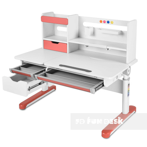 FunDesk Sentire является удлиненной на десять сантиметров версией парты Pensare. Также как и младшая версия имеет вместительную надстройку с тремя полками, выдвижным ящиком, подставкой для книг, и перфорацией для крепления дополнительных аксессуаров.