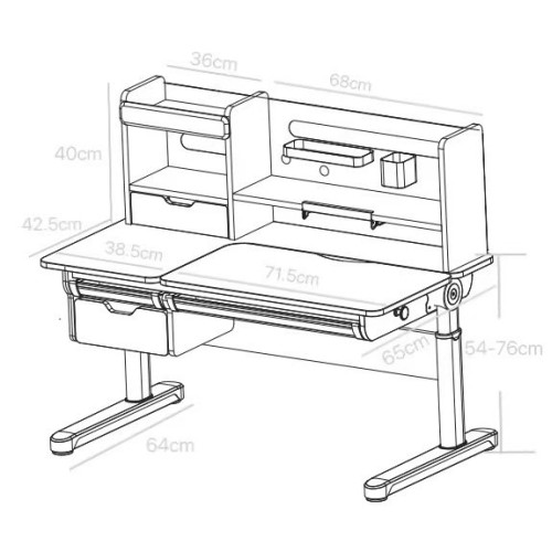 Эргономичная, растущая парта с вместительной надстройкой. Надстройка включает в себя один выдвижной ящик, три полки, выдвижную подставку для книг, и специальные отверстия для крепления аксессуаров.