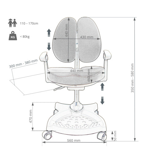 Для детей от 3 лет и до подросткового возраста. Подходит для роста от 110 до 170 см. Можно использовать как с растущей партой, так и с обычной. Изменяя глубину спинки и высоту сидения, Вы подберете наиболее комфортное положение для ребенка. Колеса имеют функцию стоп-вращения при посадке в кресло ребенка свыше 25 кг. В кресле FunDesk Leone блокировка происходит благодаря кнопке, которая при включении (функция ON) блокирует колеса и прекращает движение на любой поверхности под давлением 20 кг. При выключении кнопки (функция OFF) на колесиках кресла, его свободно можно передвигать по комнате. Малыш не будет отвлекаться от уроков, катаясь на кресле. Кресло имеет подставку для ног.