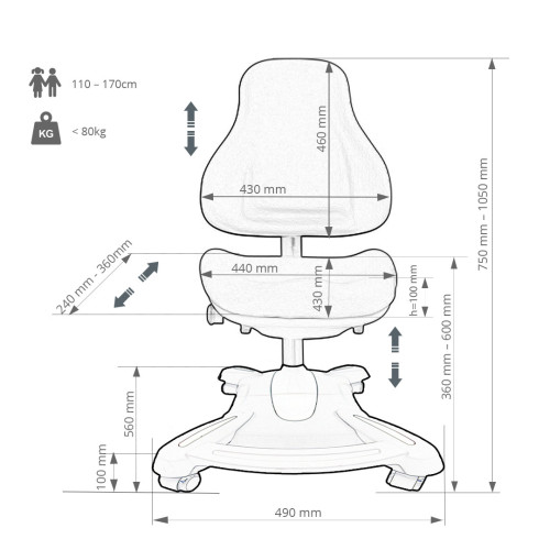 Вручную можете полностью скорректировать размеры кресла по высоте спинки и сиденья в отдельности. Наличие дополнительно встроенных стопперов в колесе обеспечивает надежность и устойчивость, а звездочное расположение препятствует опрокидыванию кресла. Легко передвигается при необходимости и полностью блокируется вращение колес при сидении. Материал экологически чистый, не имеет запаха и приятен на ощупь. Кресло оснащено подлокотниками.