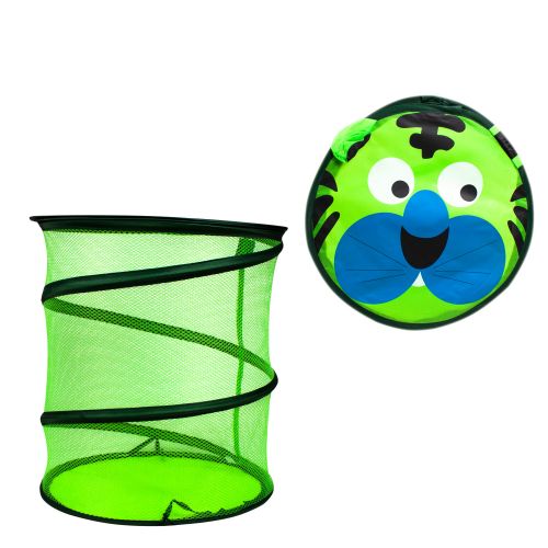 Корзина для игрушек цилиндрической формы, сетчатая. Крышечка для корзины выполнена в форме животного, закрывается с помощью липучки. Корзинку легко складывать и раскладывать за счет самораскладывающегося каркаса.