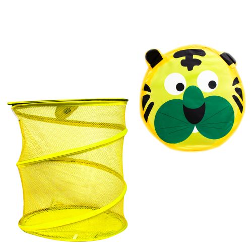 Корзина для игрушек цилиндрической формы, сетчатая. Крышечка для корзины выполнена в форме животного, закрывается с помощью липучки. Корзинку легко складывать и раскладывать за счет самораскладывающегося каркаса.