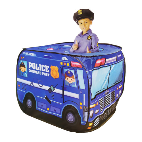 Детская игровая палатка «Полицейская машина» предназначена для детей от 3-х лет. Она выполнена в виде синей пожарной машины. Палатка имеет днище, поэтому подходит как для установки в помещении, так и на улице.
