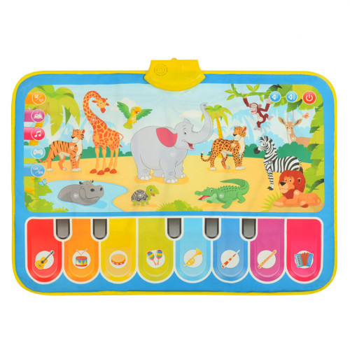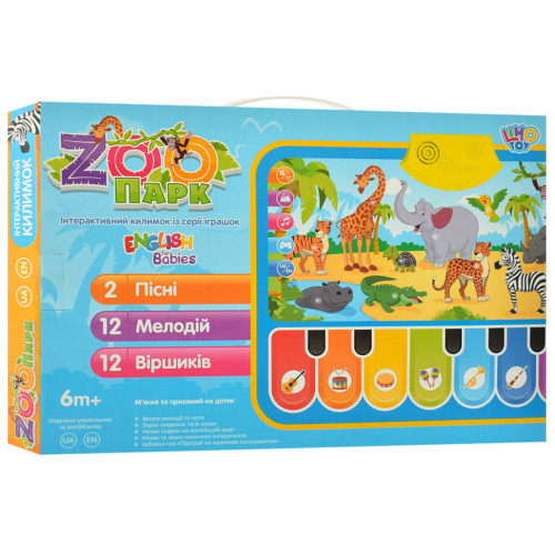 Звуковой детский коврик «Зоопарк» Limo Toy M 3676 предназначен для развития и познавания мира малышей от 6 месяцев. Коврик развивает мелкую моторику и координацию движений ребенка, его речь, зрение и слух. В изделии имеется 2 песни, 12 мелодий и 12 стихов. Когда же ребенок будет нажимать ручкой на изображения диких животных, прозвучат их названия и звуки, которые они издают. Снизу коврика изображены клавиши пианино с картинками музыкальных инструментов. При нажатии на них звучит название инструмента и звук его игры.
