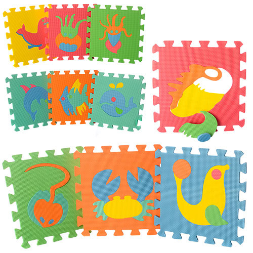 Яркий напольный коврик - пазл состоит из десяти элементов квадратной формы. Разноцветные картинки внутри квадратов состоят из отдельных маленьких частей. Они легко вынимаются и вставляются обратно. Но чтобы найти «домик» для каждого элемента и собрать пазл полностью малышу придётся немало потрудиться. Ведь для крохи это очень сложный и увлекательный процесс, требующий максимальной усидчивости, внимания и ловкости маленьких пальчиков.