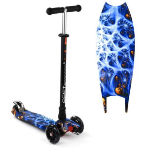 Самокат четырехколесный 'Best Scooter'. Передние - 12 см, задние сдвоенные - 7,5 см, все со светом. Рама и руль – алюминий; дека – пластик; колеса – полиуретан. Высота руля - от 62 до 84 см. Максимальная нагрузка - 60 кг. Задний ножной тормоз.