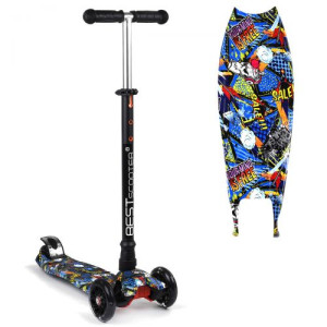 Самокат четырехколесный 'Best Scooter'. Передние - 12 см, задние сдвоенные - 7,5 см, все со светом. Рама и руль – алюминий; дека – пластик; колеса – полиуретан. Высота руля - от 62 до 84 см. Максимальная нагрузка - 60 кг. Задний ножной тормоз.