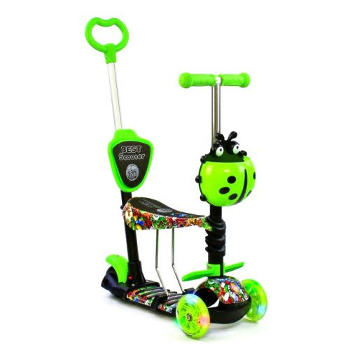 •Алюминиевый Т-образный руль; • Регулировка высоты руля; • Ручки выполнены из качественной резины с рельефным узором; • Наклонный поворот руля; • Ручка родительского контроля (высота регулируется); • Подножки; • Сидение, спинка, корзинка, подножки и ручка родительского контроля – съемные, и изготовлены из высокопрочного износостойкого пластика; • Ножной тормоз (step-on-brake), располагается над задним колесом; • 2 вида колес. Два передних светятся и изготовлены из полиуретана (PU), а заднее - из поливинилхлорида (пластика PVC); Длина деки - 54 см; Ширина деки – 14 см; Минимальная высота руля от пола – 63 см, максимальна высота руля - 72 см; Длина руля - 26 см, диаметр ручек - 3.5 см; Минимальная длина ручки родительского контроля – 75 см; максимальная – 85 см. Минимальная высота сидения от пола – 27 см; максимальная – 32 см. • Размеры колес: Передние колеса PU: диаметр - 12 см, ширина – 3 см; Заднее колесо PVC: диаметр - 9 см, ширина – 4 см.