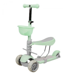 Самокат 2в1: можно использовать и как самокат и как беговел. Конструкция разборная; Выполнен из метала и пластика. Колеса выполнены из полиуретана, со светом (диаметр - 10,5 см. - передние, 8 см. - заднее). Металлический руль с резиновыми ручками регулируется по высоте до 76 см. К рулю крепится пластиковая корзинка. Сиденье покрыто плотным поролоном. Максимальная нагрузка: 30 кг.