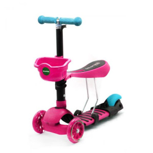 Самокат 2в1: можно использовать и как самокат и как беговел. Конструкция разборная; Выполнен из метала и пластика. Колеса выполнены из полиуретана, со светом (диаметр - 10,5 см. - передние, 8 см. - заднее). Металлический руль с резиновыми ручками регулируется по высоте до 76 см. К рулю крепится пластиковая корзинка. Сиденье покрыто плотным поролоном. Максимальная нагрузка: 30 кг.