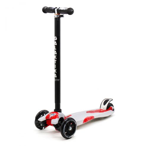 Самокат трехколесный, складной. Устойчивая, надежная конструкция, поворот осуществляется наклоном руля. Рама самоката выполнена из алюминия, дека - из пластика. Высота руля регулируется от 56 до 71 см. Размер деки - 13х32 см. Колеса самоката выполнены из полиуретана, со светом (диаметр: 12 см. - передние колеса; 8 см. - задние). Подшипники типа ABEC-7. Есть задний ножной тормоз. Максимальная нагрузка - 50 кг.