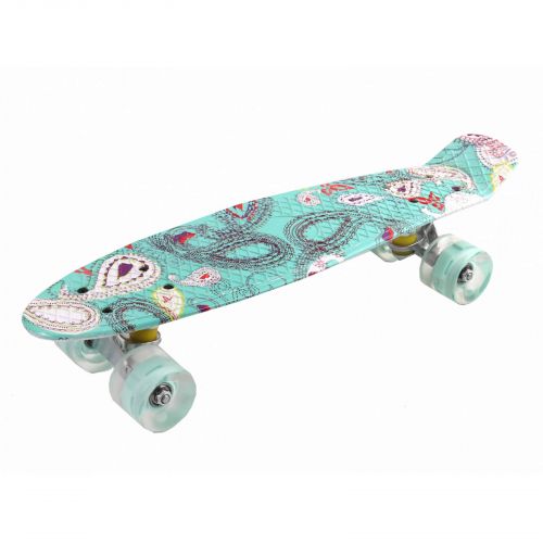 Пенни Борд. Легкая дека сделана из прочного формованного пластика. Длинна деки - 55 см., ширина - 15 см. Принт нанесен на деку с одной стороны. Колёса PU, со светом, d=6 см. Максимальная нагрузка 70 кг.