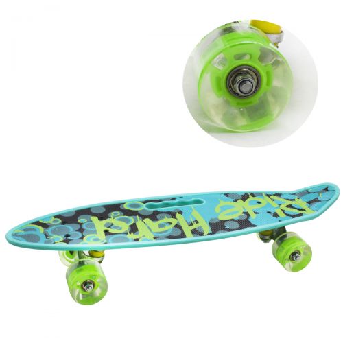 Пенни борд. Легкая дека сделана из прочного формованного пластика. Дека с ручкой. Длинна деки - 59 см., ширина - 16 см. Колёса PU со светом, d=6 см. Максимальная нагрузка 70-80 кг. Цвет колес может отличаться от указанного на фото.
