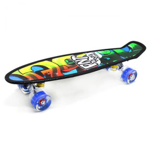 Пенни Борд со светящимися колёсами. Дека пенни борда изготовлена из жесткого пластика и покрыта анти-скользящей лентой. Покрытие верхней части деки: цветной наждак (Grip Tape). Колёса скейта выполнены из полиуретана, что делает катание бесшумным. Каждое колесо светится во время движения. Длинна деки - 56 см, ширина - 14,5 см. Колёса PU, со светом, d=6 см. Подшипники: ABEC – 7. Подвески: алюминий. Максимальная нагрузка 70-80 кг.