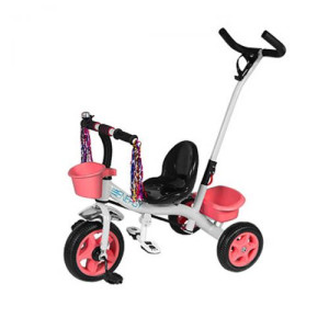 Велосипед оснащен высоким рулем с защитными накладками (на руле есть звоночек), сиденьем со спинкой, широкими пластиковыми педалями и складной подставкой для ног. Рама велосипеда металлическая. Можно регулировать расстояние между сидением и рулем (есть 2 положения). Педали легко крутятся, благодаря подшипникам. EVA колеса (диаметр переднего колеса - 25 см., заднего - 20,5 см.). К велосипеду крепится 2 корзинки, есть ручка для родителей. Для детей от 2-х лет.