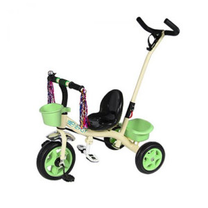 Велосипед оснащен высоким рулем с защитными накладками (на руле есть звоночек), сиденьем со спинкой, широкими пластиковыми педалями и складной подставкой для ног. Рама велосипеда металлическая. Можно регулировать расстояние между сидением и рулем (есть 2 положения). Педали легко крутятся, благодаря подшипникам. EVA колеса (диаметр переднего колеса - 25 см., заднего - 20,5 см.). К велосипеду крепится 2 корзинки, есть ручка для родителей. Для детей от 2-х лет.
