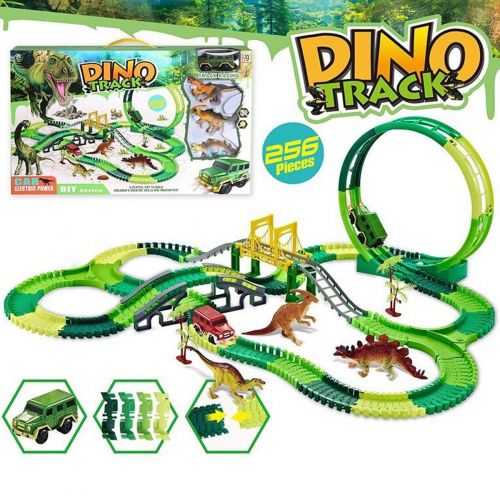 Яркий, красочный трек. Будет замечательным подарком ребенку. У данного автотрека гибкая колея, есть мост, мертвая петля. В комплекте с деталями трека есть 3 фигурки динозавра, 1 машинка, локации. Состоит из 256 деталей. Для детей от 3-х лет.