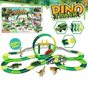 Яркий, красочный трек. Будет замечательным подарком ребенку. У данного автотрека гибкая колея, есть мост, мертвая петля. В комплекте с деталями трека есть 3 фигурки динозавра, 1 машинка, локации. Состоит из 294 деталей. Для детей от 3-х лет.