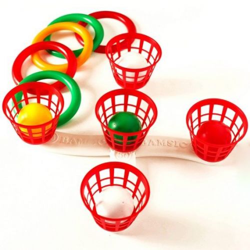 Кольцеброс. Цель игры: попасть шариками в корзинку, кольцами на столбики и набрать больше баллов чем соперник. В комплекте: основа, 5 шариков, 5 столбиков, 5 корзинок и 5 колец.