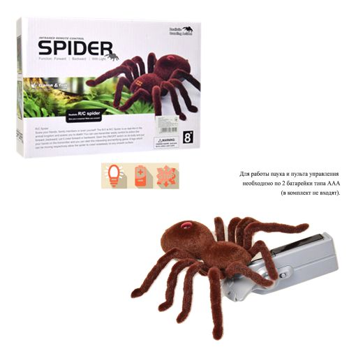 Паук на радиоуправлении. В наборе есть пульт управления, с помощью которого можно управлять пауком (может двигаться вперед и назад). Имеет бархатное покрытие. Работает на батарейках. Размер паука: 16 х 16 см.