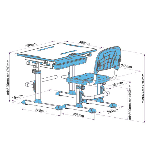 Стол и стул могут быть легко отрегулированы по высоте, что позволяет оптимально адаптировать его под соответствующий рост ребенка.
