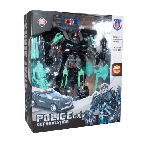Трансформер 'Полицейская машина'. Трансформируется из большого боевого робота в полицейскую машинку. В форме робота оснащен набором оружия: топор, автомат и большая ракетница, которая стреляет специальными снарядами (3 в комплекте). Высокая детализация.