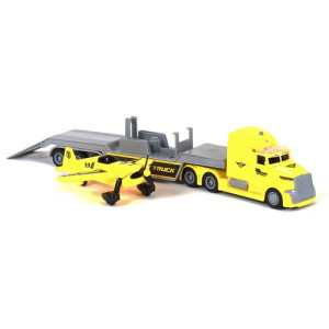 Машинка трейлер со спортивным самолётом на борту. На верху кабины грузовика есть кнопка при нажатии на которую грузовик издаёт звук зажигания и работы мотора, а в это время вся крыша светится ярким светом. Самолёт съёмный. Масшатаб: 1:50. Длина самолёта 14 см.