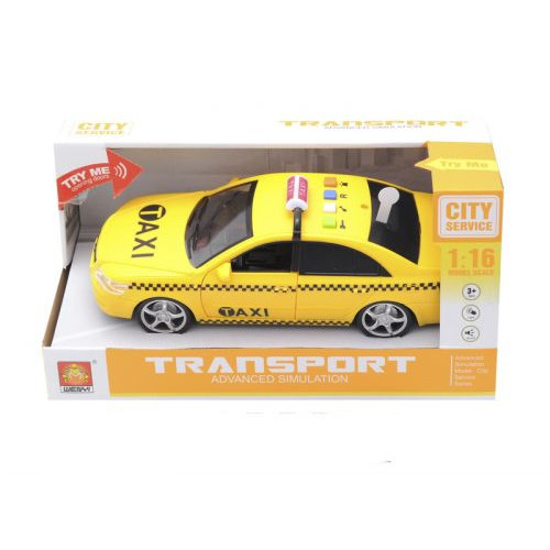 Интерактивная инерционная машина такси. Открываются двери. Имеет звуковые и световые эффекты. Изготовлена из качественного пластика. Разные цвета в ассортименте. Масштаб: 1:16.