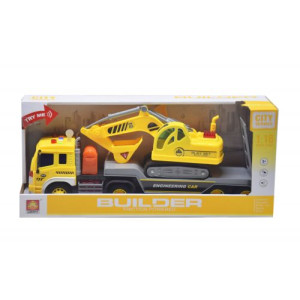 Трейлер музыкальный с экскаватором 'Builder'. Трейлер музыкальный, инерционный, имеет 4 кнопочки: звук мотора, звук работы трейлера, клаксон, спецсигнал. Со световыми эффектами. Поворотная башня экскаватора, подвижная стрела и ковш. Размер экскаватора - 23 х 8,5 х 13 см. Масштаб - 1:16.