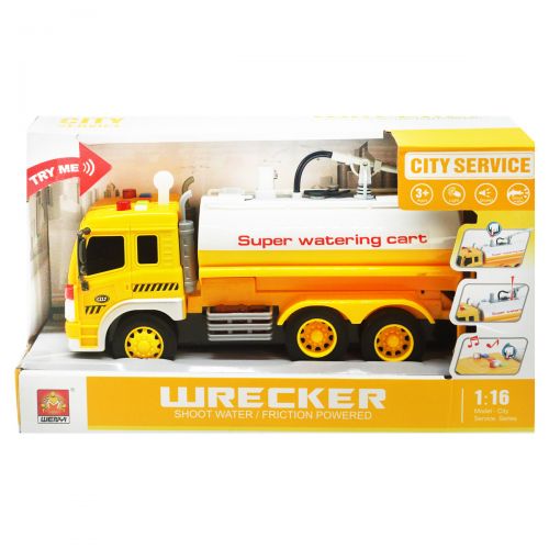 Машина с водяной помпой будет интересным подарком ребёнку. Машина инерционная. Есть световые и звуковые эффекты (светится мигалка, есть звук мотора, сигналит). Так же, есть водяная помпа, которая 'стреляет' водой. Размер машины - 28 х 12,5 см., диаметр колес - 4,5 см. Выполнена из качественного пластика. Для детей от 3-х лет.