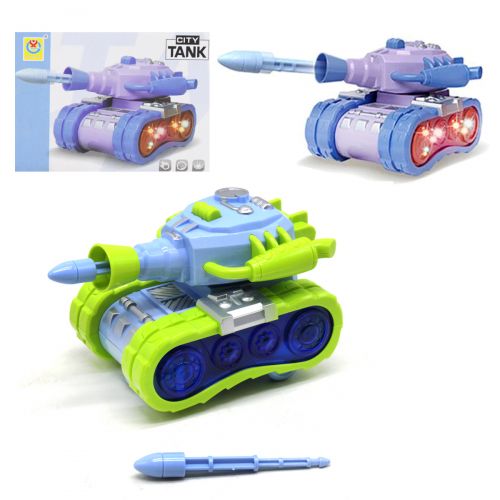 Забавная игрушка 'Танк'. Оснащена световыми и звуковыми эффектами: говорит фразы на английском, издает звуки мотора и стрельбы, светятся колеса танка (гусеничная лента без света). Так же, танк хаотично передвигается в разных направлениях, и стреляет снарядами. Размер - 12х9х9 см. Выполнен из качественного и прочного пластика. Разные цвета в ассортименте.