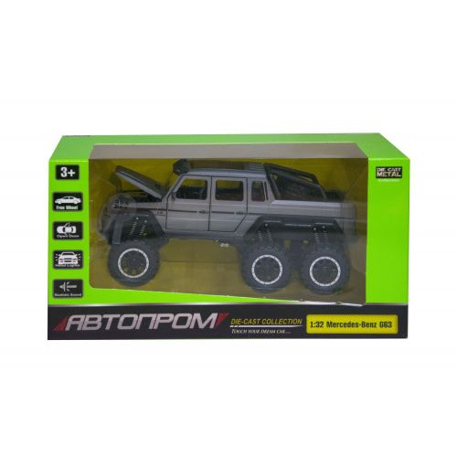Машинка 'Mercedes-Benz G63' из серии 'Автопром'. Металлическая. Открываются передние задние двери, капот и багажник. Имеет световые и звуковые эффекты. Высокая детализация интерьера и экстерьера. Масштаб - 1:32.