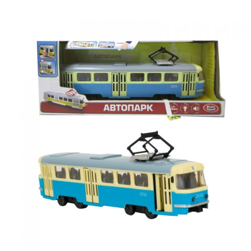 Трамвай инерционный из серии 'Автопарк'. Двери открываются, подсветка салона, свет фар. Музыкальное сопровождение и веселые фразы ('Осторожно двери закрываются'). Масштаб 1:54.