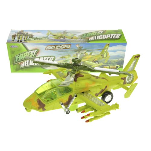 Интересная игрушка - военный вертолет. Оснащен звуковыми и световыми эффектами - светятся крылья, хвост и кабина, вращаются лопасти, ездит. Работает на батарейках. Размер игрушки 33х25х11 см.