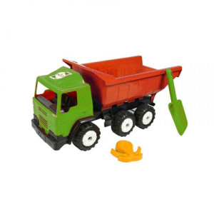 Авто 'Лидер'. Колеса большие и мощные. Кузов опрокидывается для удобства разгрузки. Кроме грузовика, в комплекте есть формочка и лопатка.