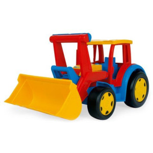 Яркий пластиковый трактор с подвижным ковшом и большими колёсами. Изготовлен из качественного пластика. Ребёнок может кататься верхом на тракторе. Грузоподъёмность трактора - 100 кг.