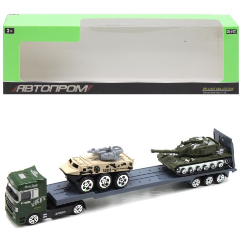 Игровой набор включает в себя автовоз, танк и бронетранспортёр. Все элементы комплекта хорошо детализированы. Машинки выполнены в масштабе 1:50. Выполнены из качественного и прочного материала. Размер автовоза 24х4,5х3 см. Для детей от 3-х лет.