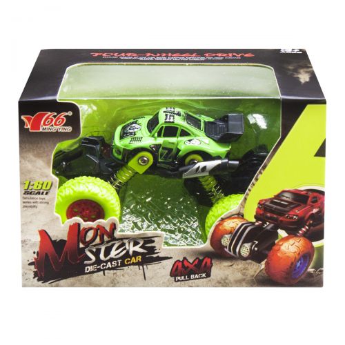Машинка-джип 'Монстр', инерционная. Машинка имеет передние и задние амортизаторы, а также, прорезиненые колёса. Диаметр колеса - 3 см. Масштаб - 1:60.