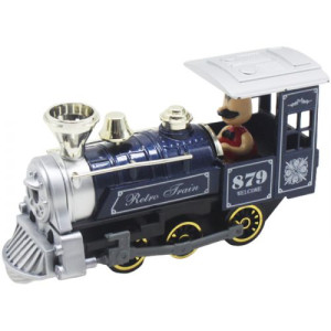 Металлический инерционный поезд со светом и звуком. Если нажать на кнопочку рядом с трубой, включается подсветка и начинает играть веселая мелодия. В кабине есть фигурка водителя, которая при езде качается из стороны в сторону. Высокая детализация. Выполнен из качественных и прочных материалов. Размер: 8х5х15.5 см.