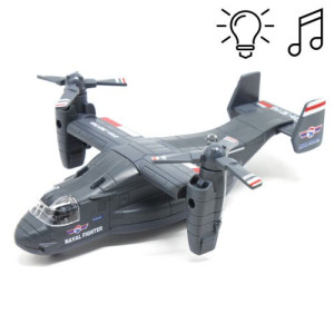 Реалистичная копия настоящего самолета. Инерционный. Имеет подвижные элементы (лопасти, пропеллер). Оснащен звуковыми эффектами и фразами на английском. Со светом. Изготовлен из металла и качественного пластика. Длина - 17 см.